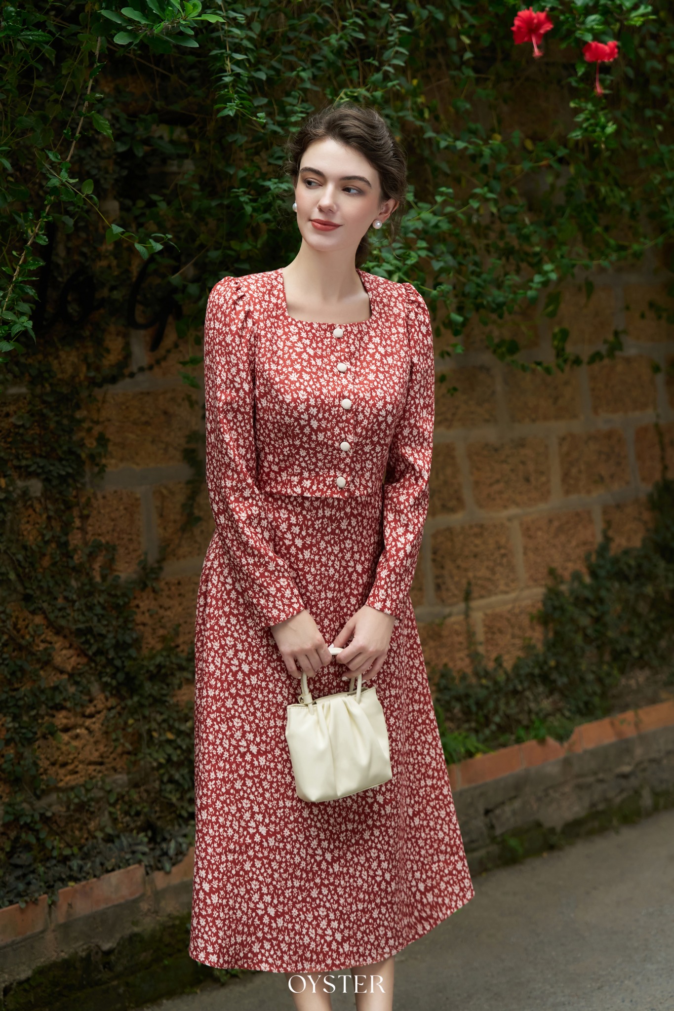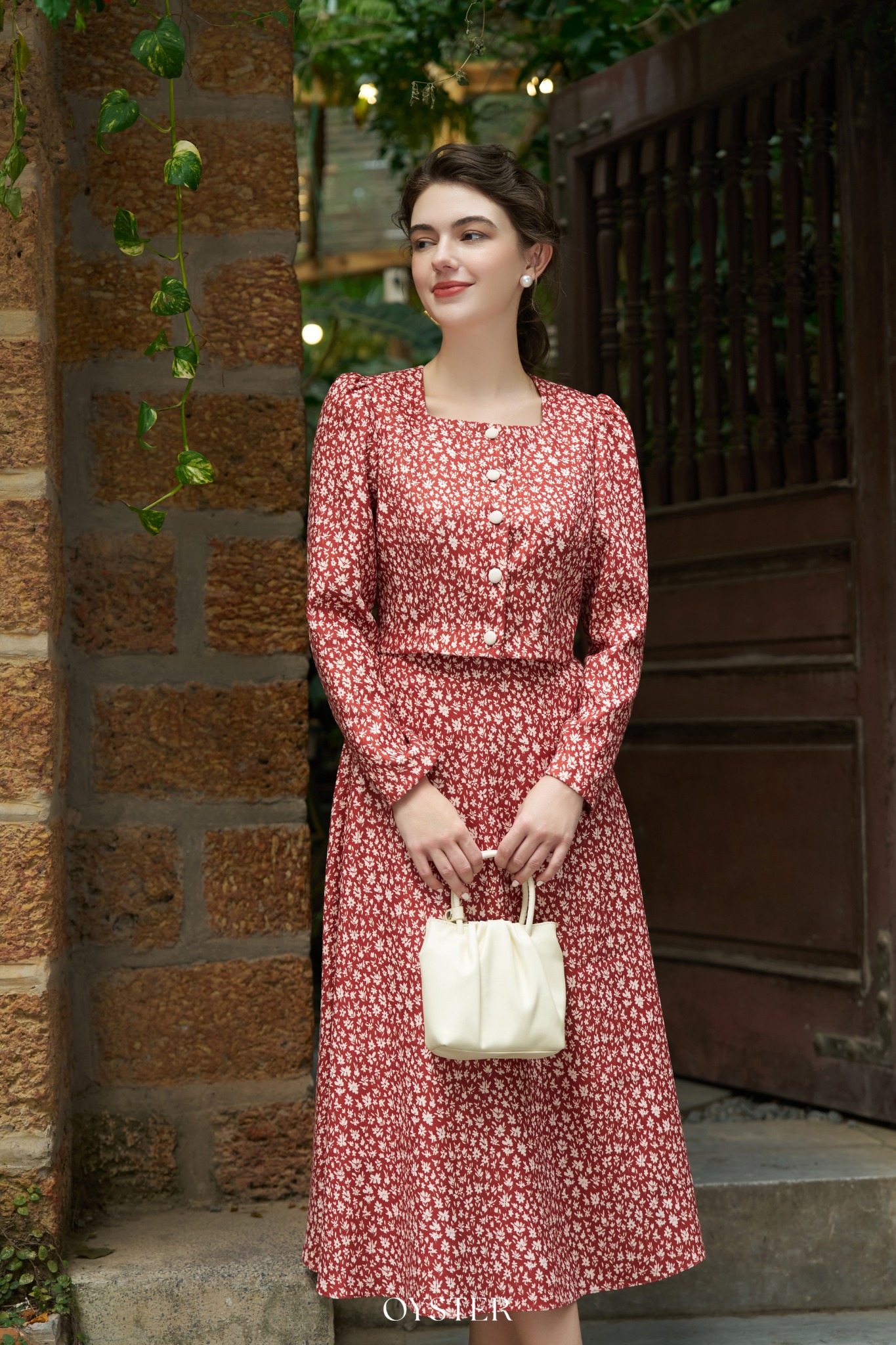 * Kiểu dáng: Áo cổ vuông, tay bồng nhẹ, phối cúc trắng