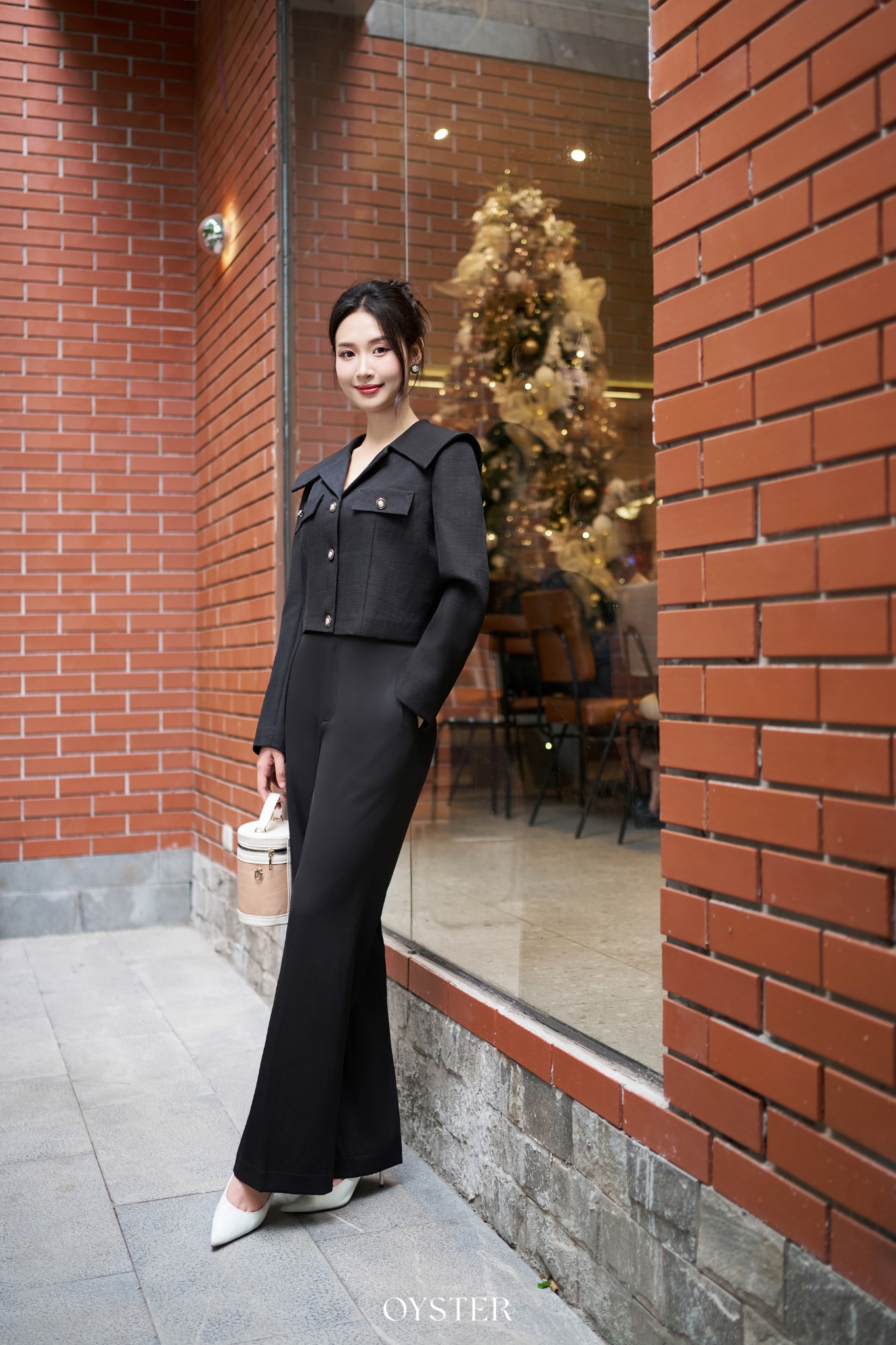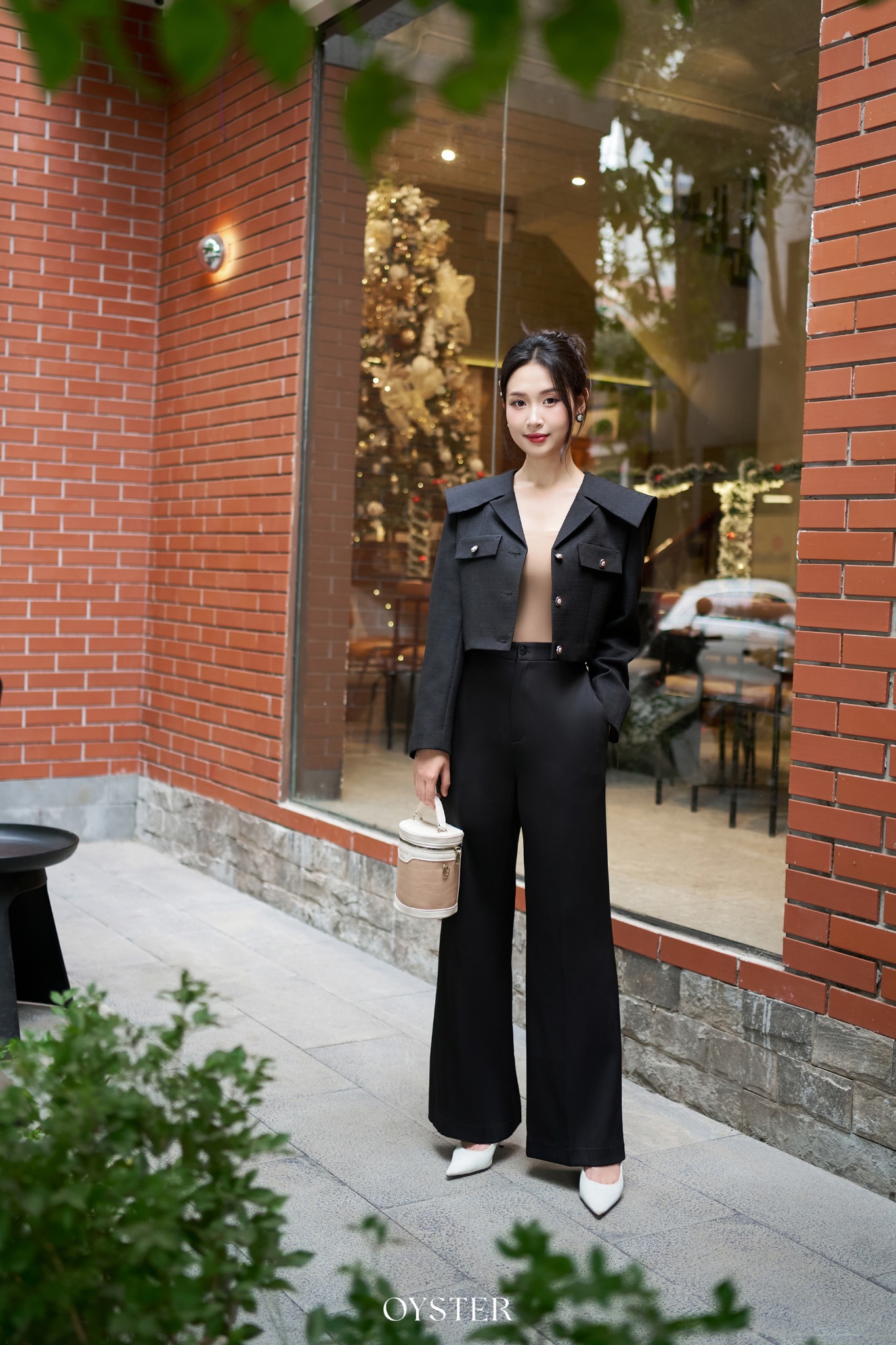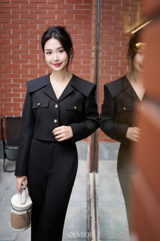 * Kiểu dáng: áo khoác dáng lửng, đệm vai, cúc kim loại