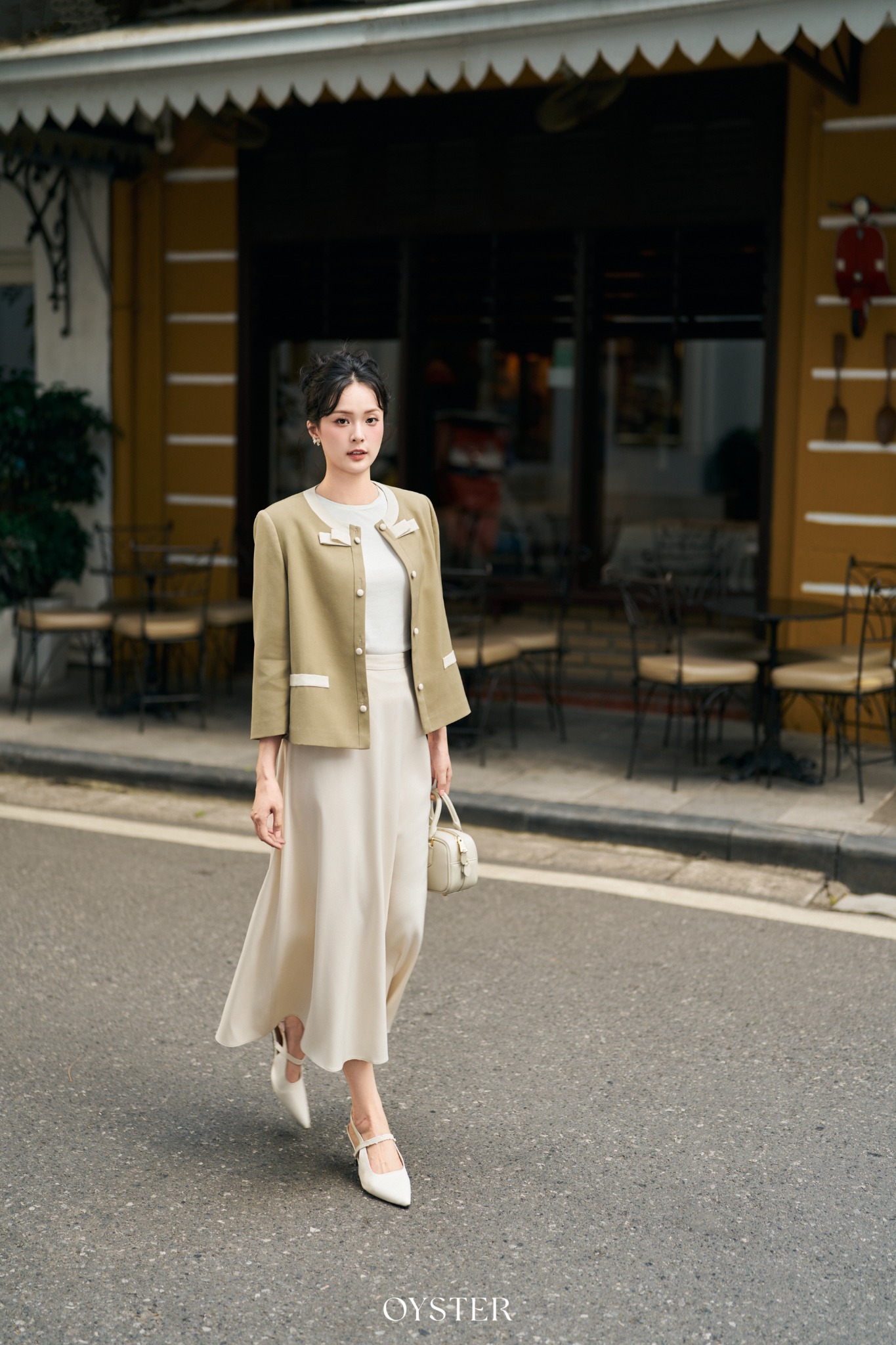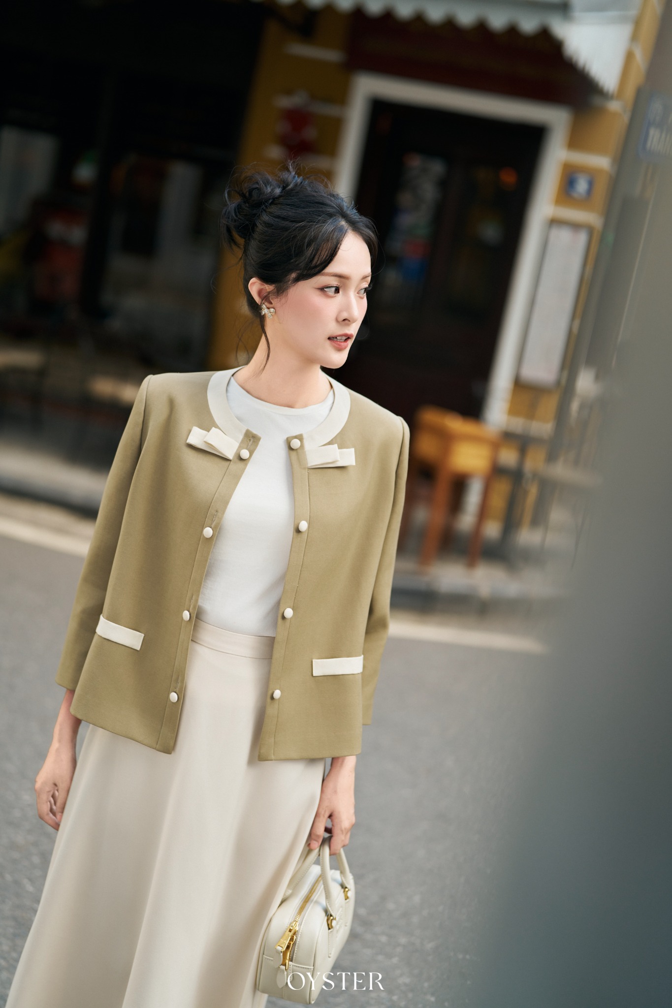 * Kiểu dáng: áo khoác cổ tròn cách điệu, dài tay