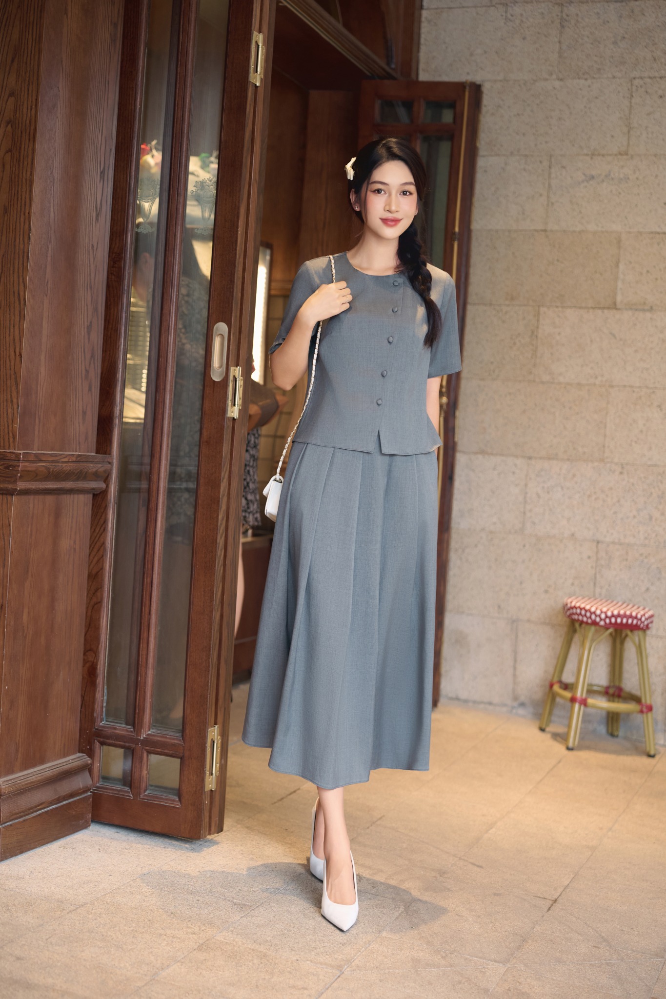 * Kiểu dáng: chân váy xếp ly dáng midi