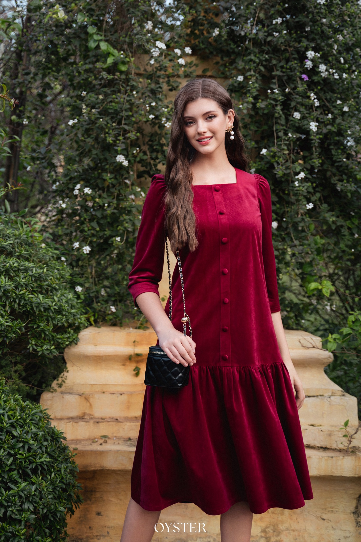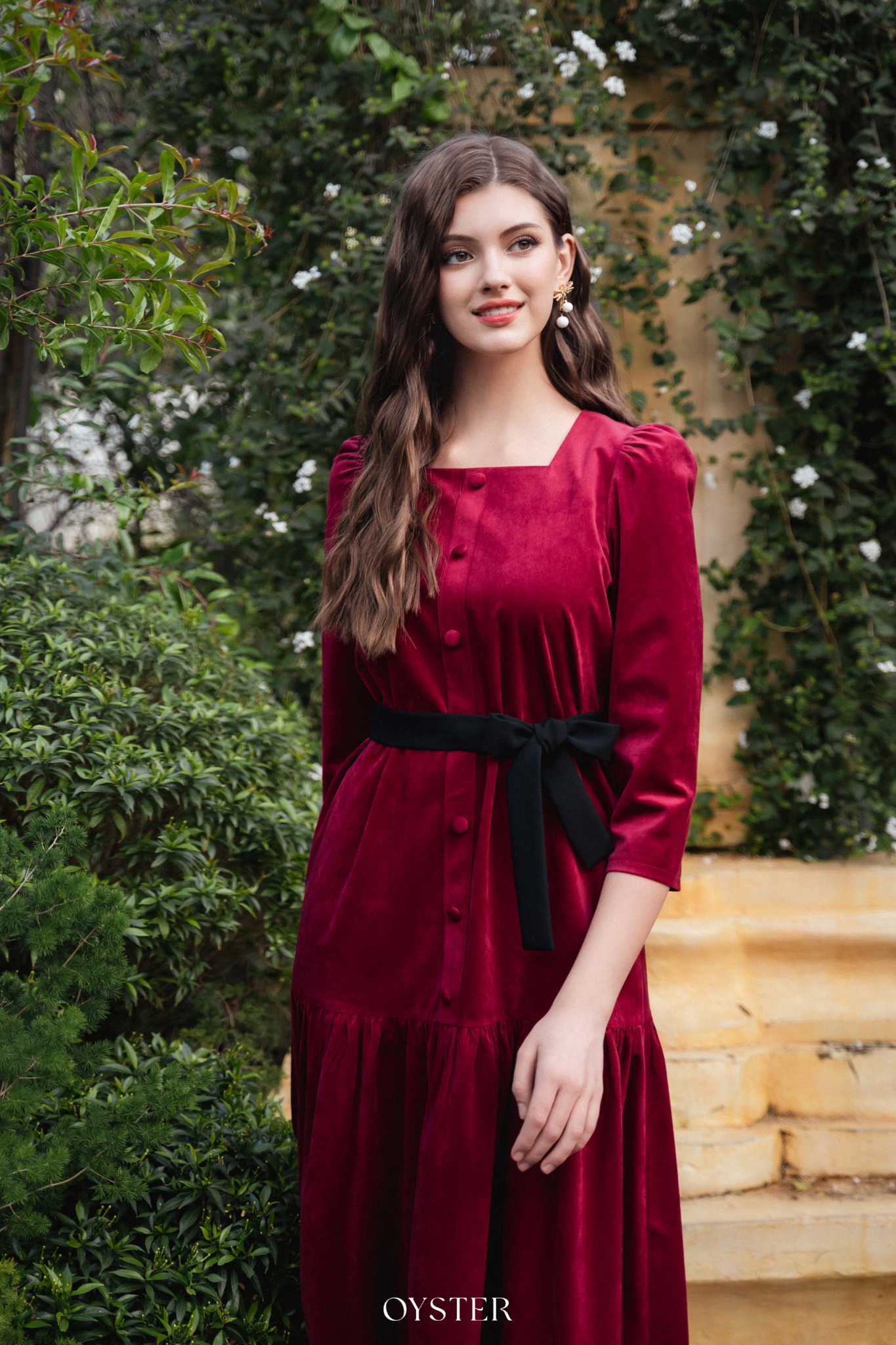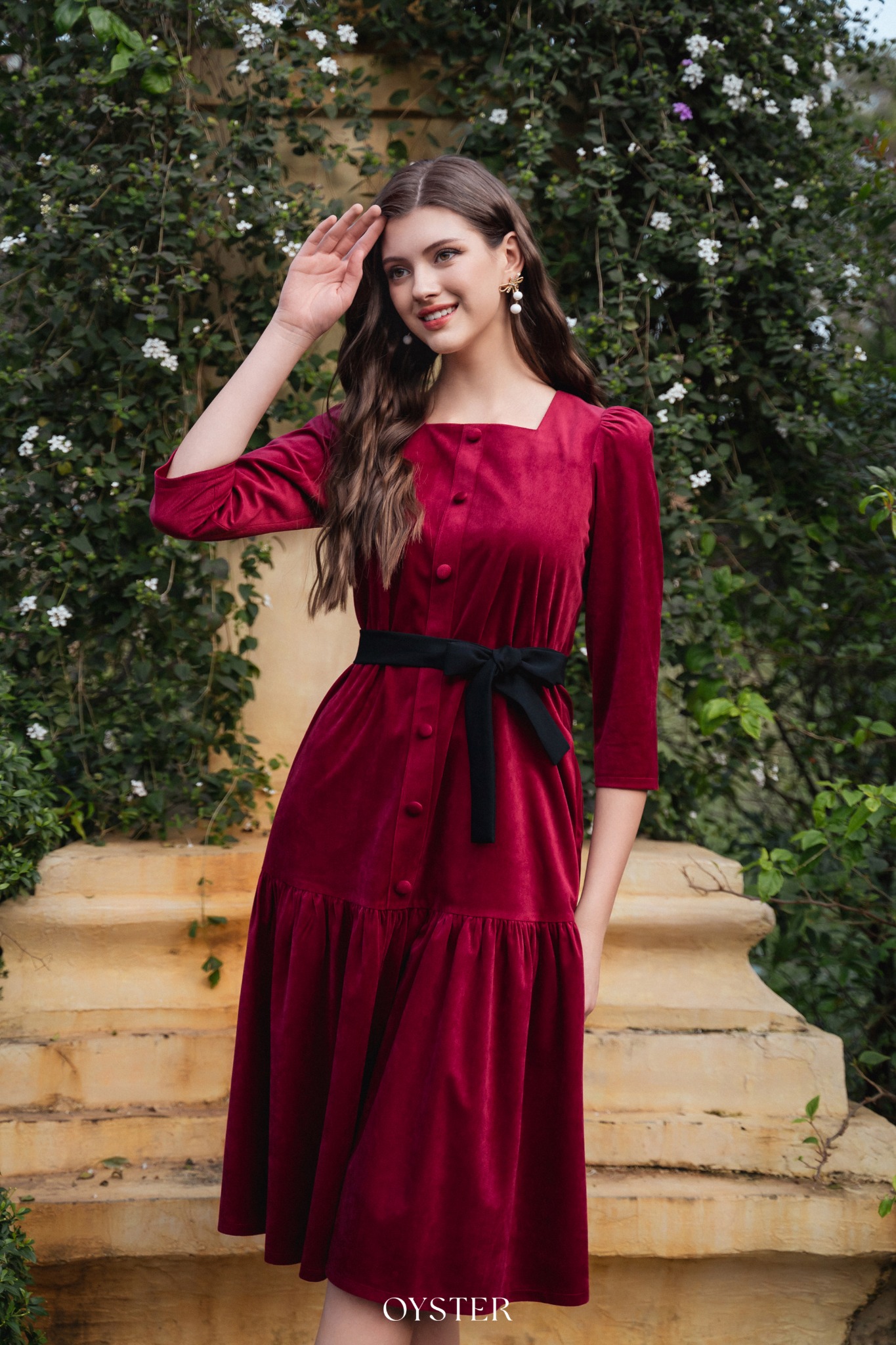 * Kiểu dáng: Váy cổ vuông, tay bồng nhẹ, phối cúc và đai eo