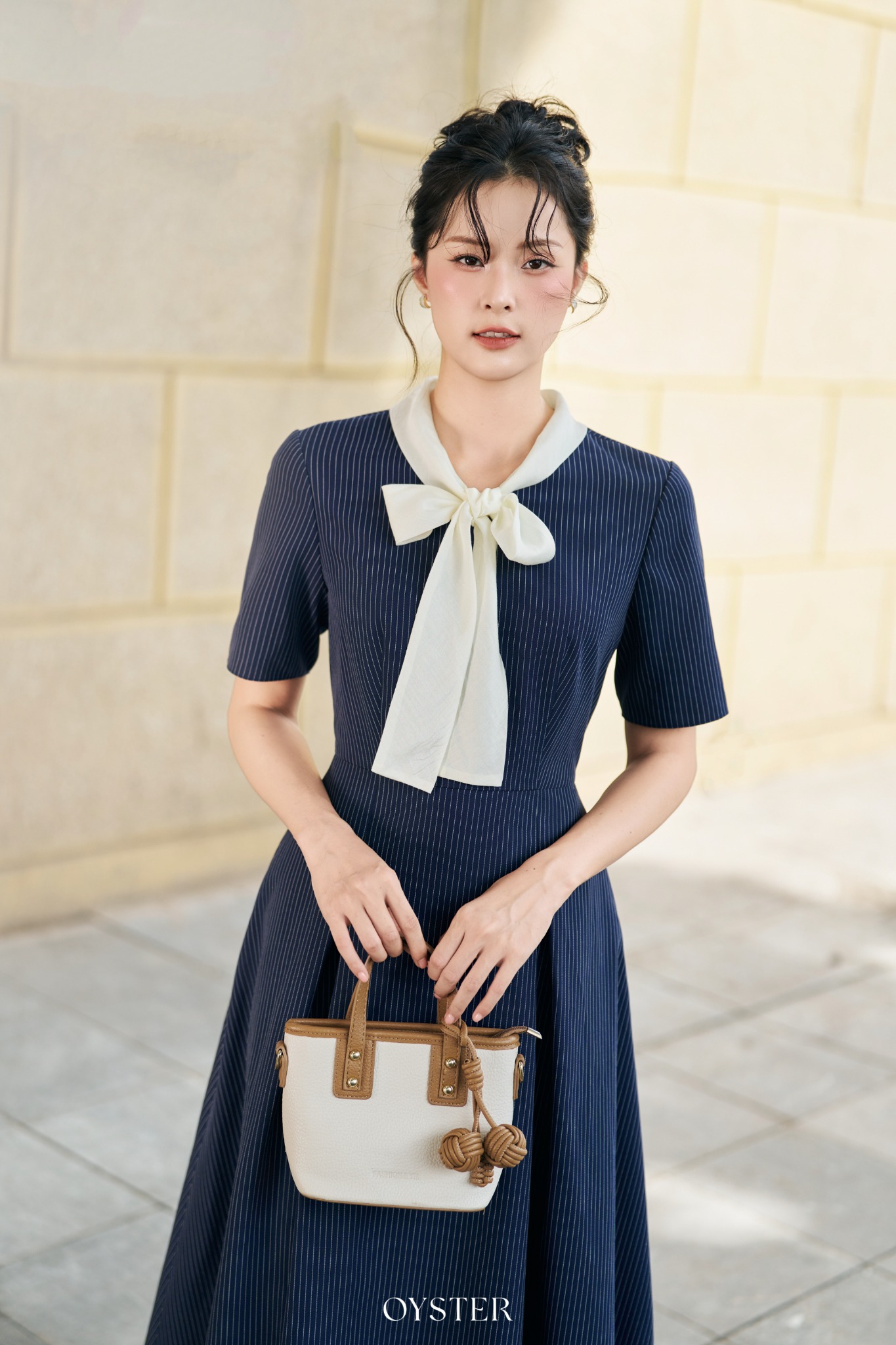 * Kiểu dáng: váy dài chiết eo, cổ phối cách điệu nơ