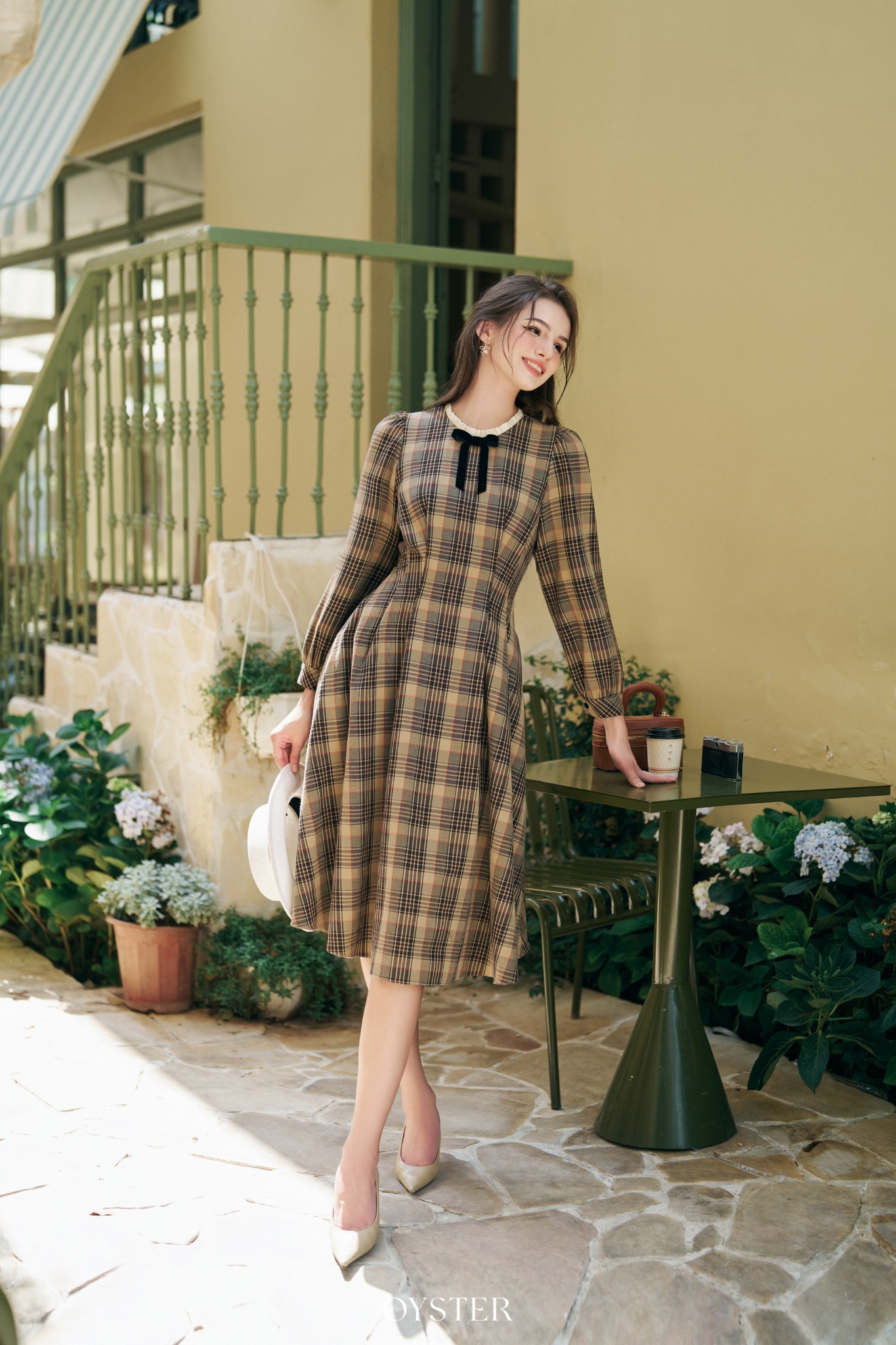 * Kiểu dáng: Váy kẻ cổ ren đính nơ, tay dài đánh bồng, chiết eo
