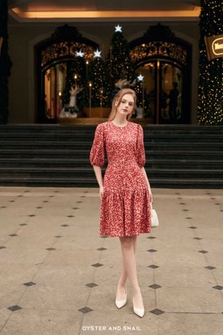 Váy công sở dáng chiết eo, cổ tròn, tay bồng, cúc thật.