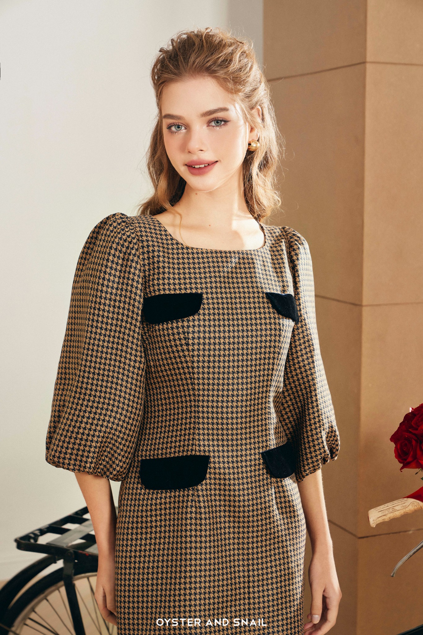 Váy công sở dáng A, chiết eo nhẹ cổ tròn, tay bồng, khóa sau, 2 lớp.