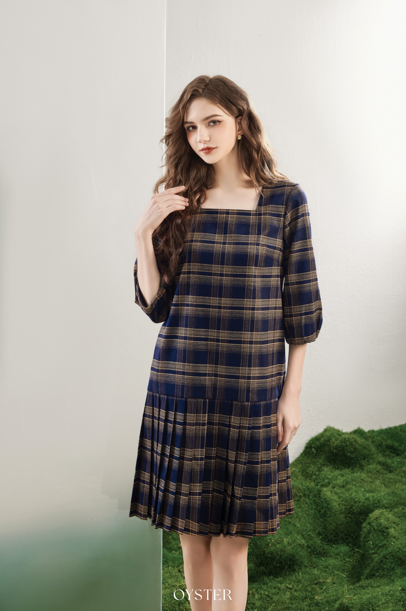 * Kiểu dáng: Váy kẻ tay bồng, cổ vuông, chân váy xếp ly