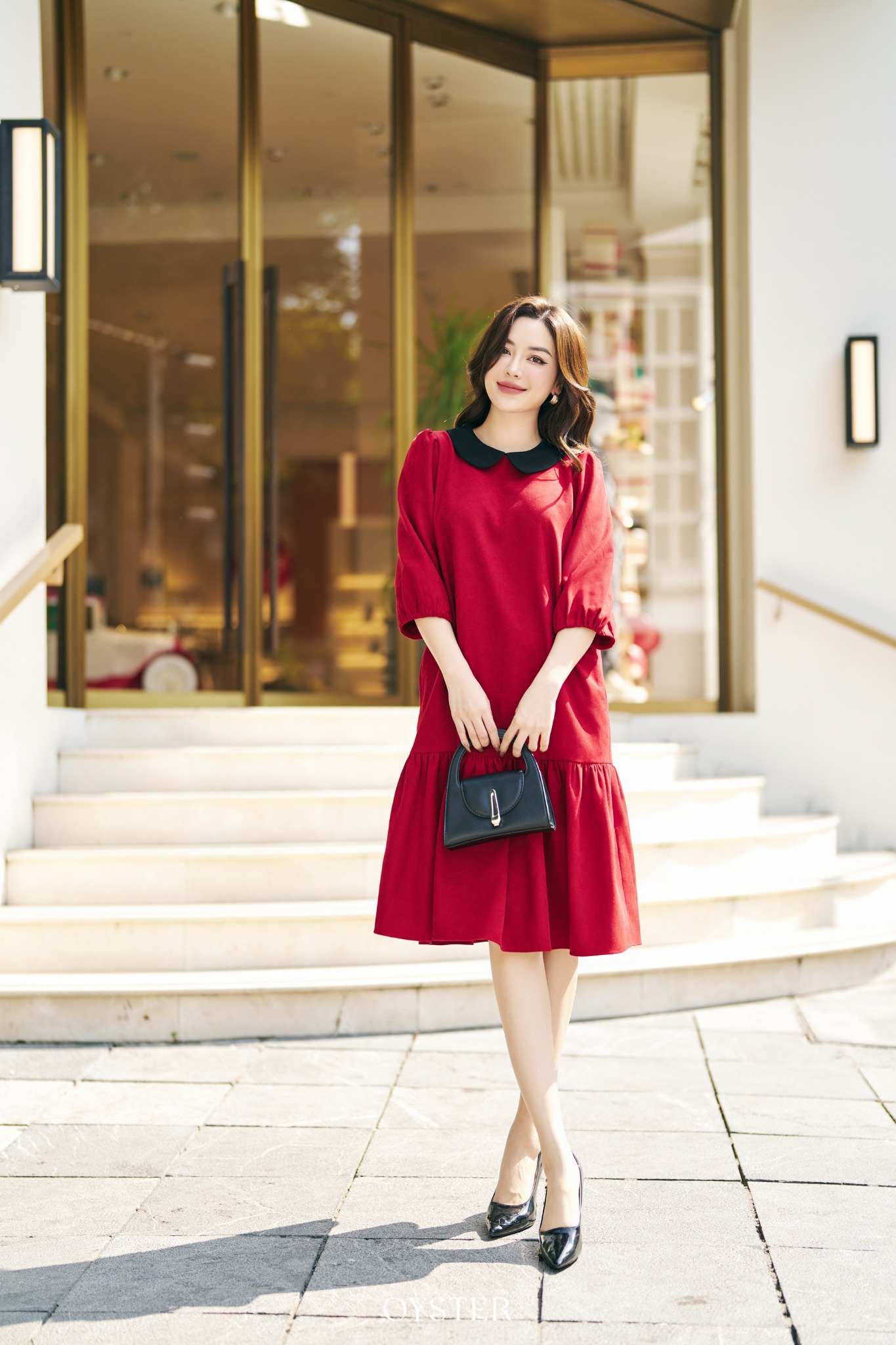 * Kiểu dáng: Váy cổ sen, tay bồng dáng suông, chân váy nhúm tạo độ xòe