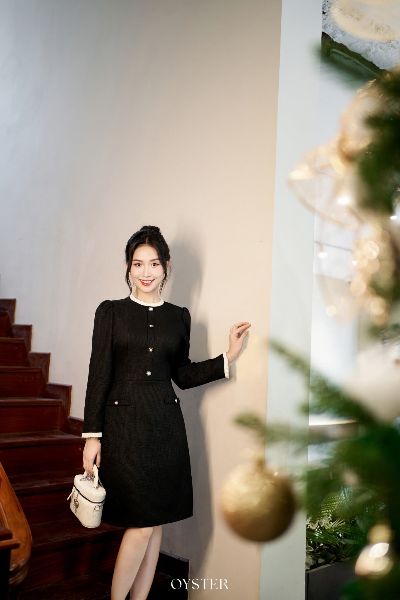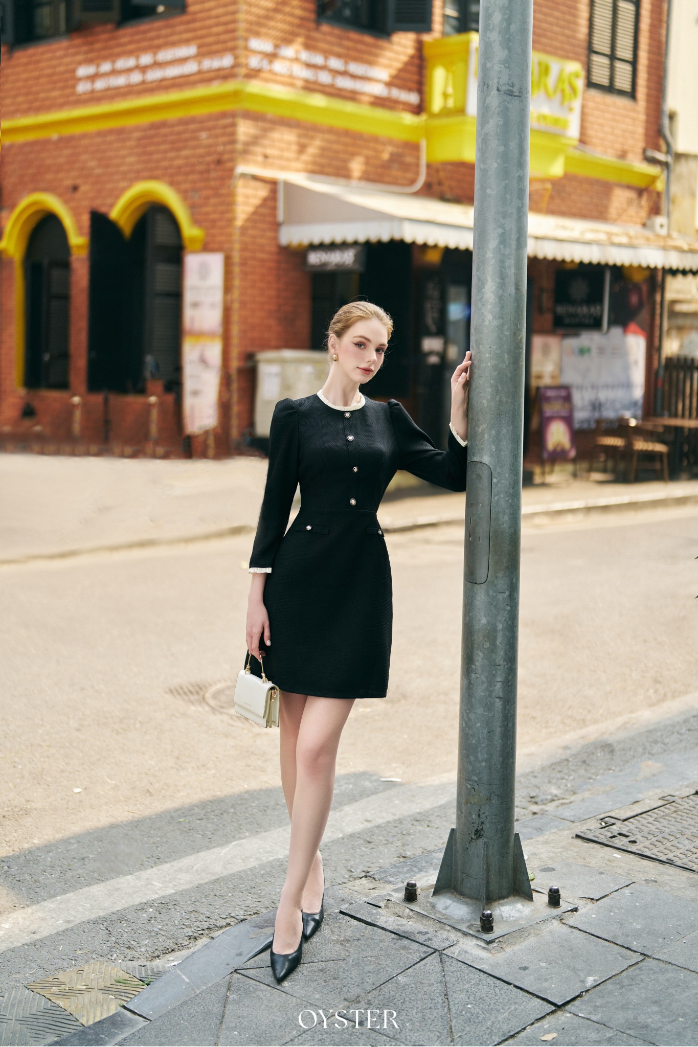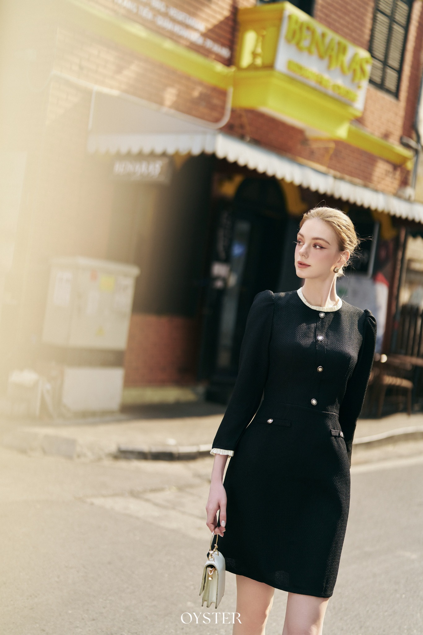 * Kiểu dáng: váy cổ tròn, bèo nhún be, cúc kim loại, chiết eo nhẹ