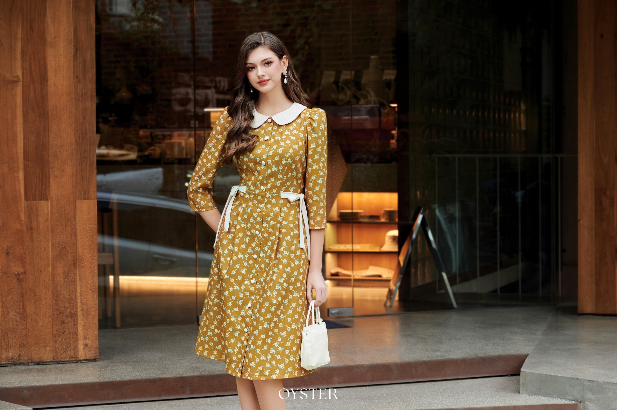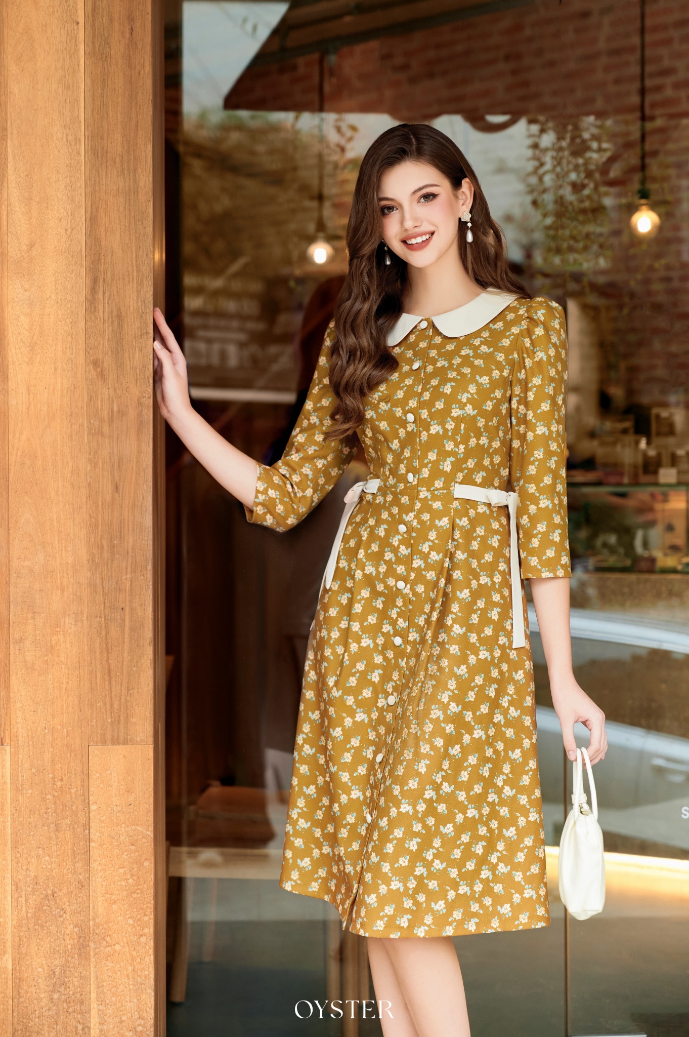 * Kiểu dáng: váy cổ sen, cúc dọc, nơ nhấn eo.