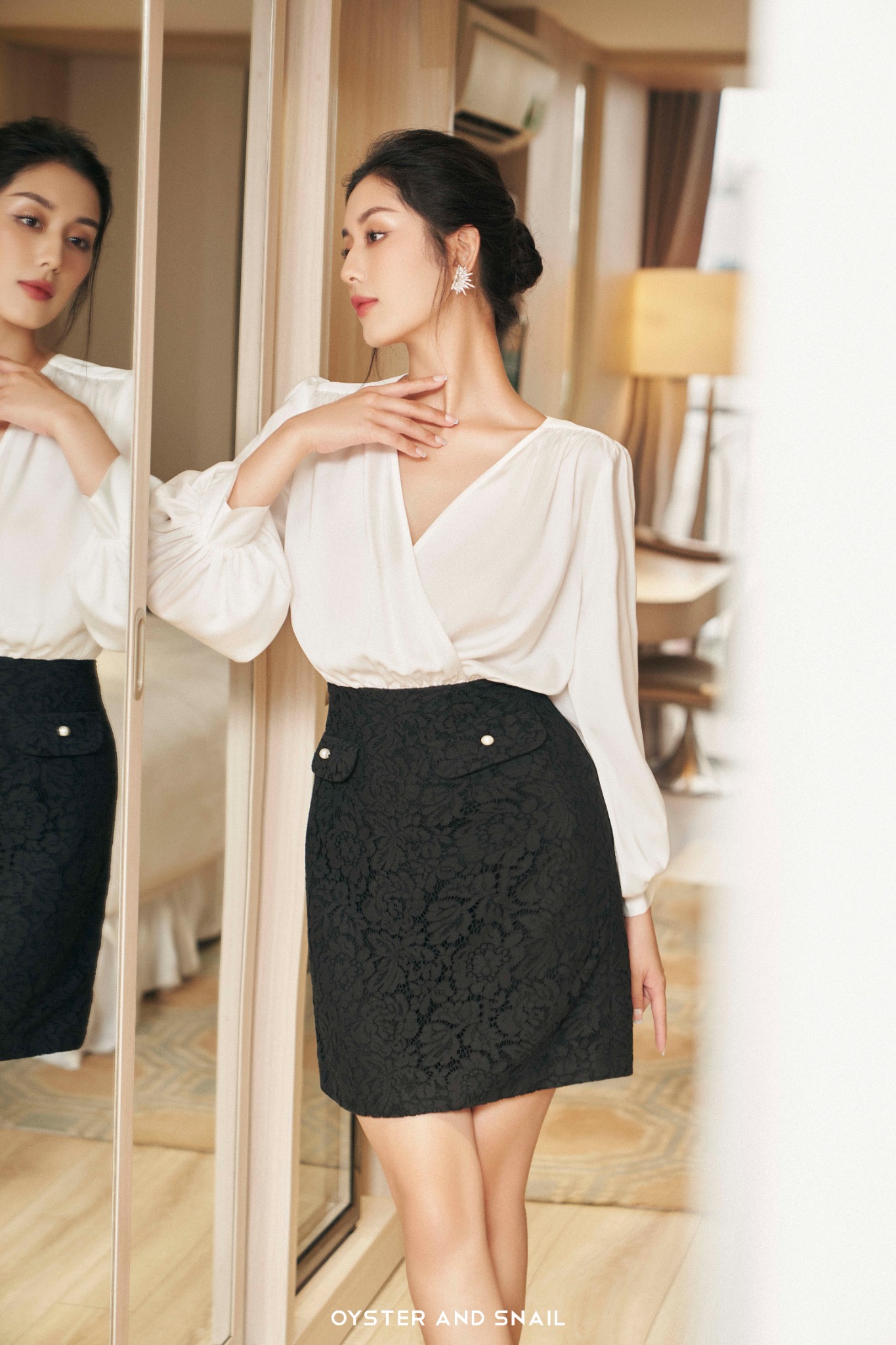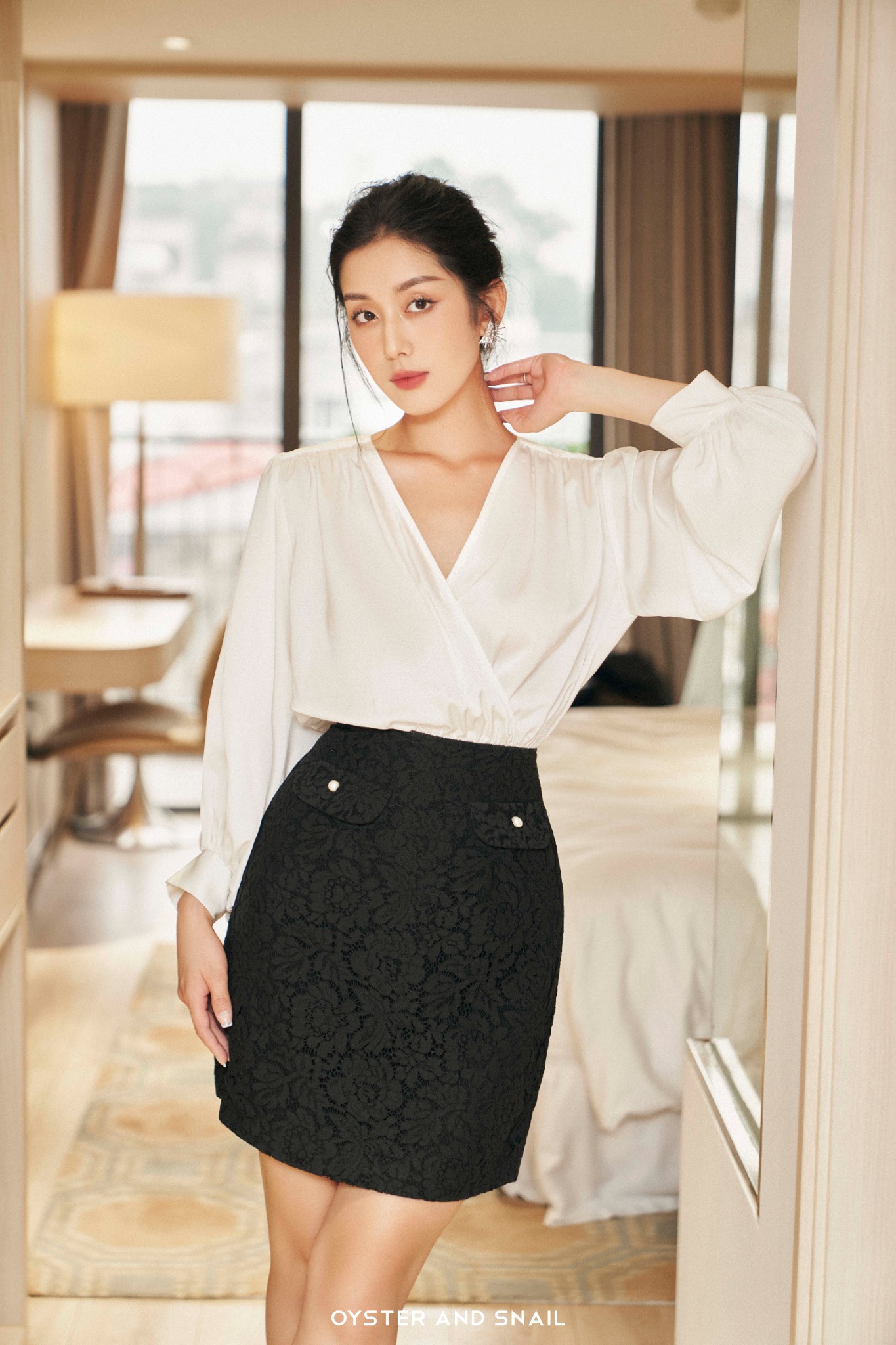 - Chất liệu: Lụa ngọc trai trắng phối chân nhung leo phủ ren đen.