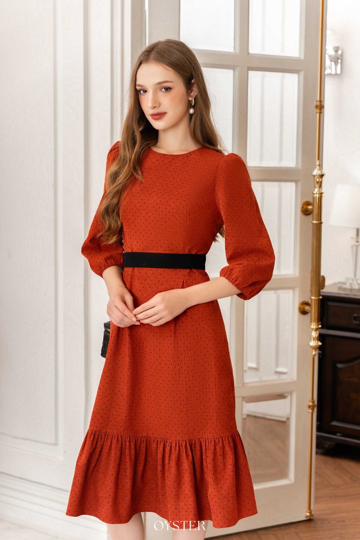 * Kiểu dáng: Váy cổ tròn, tay bồng, phối đai eo đen, chân váy nhúm phần tầng