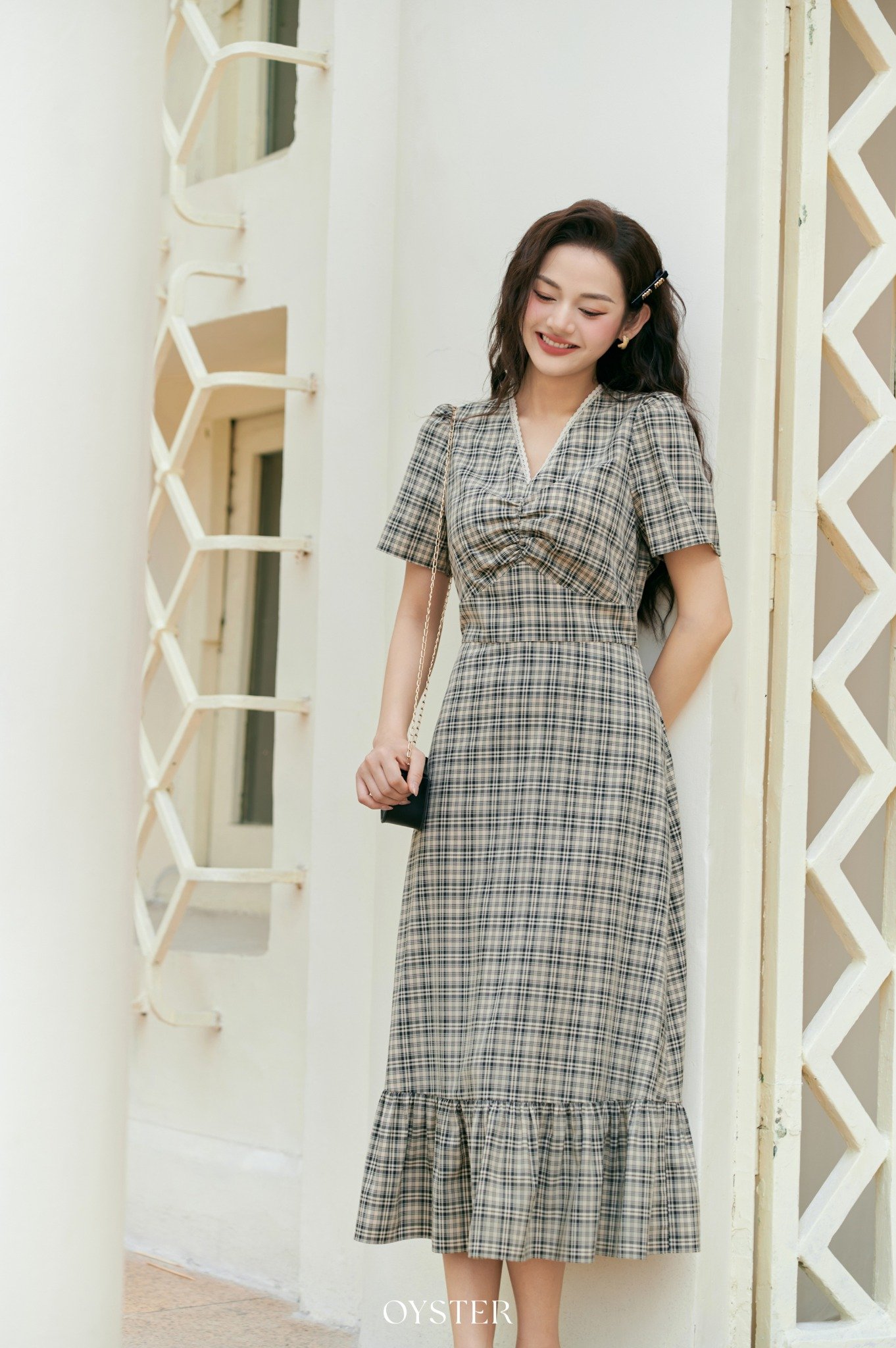 * Kiểu dáng: váy ngắn tay, cổ v nhún, chiết eo, chân váy đuôi cá