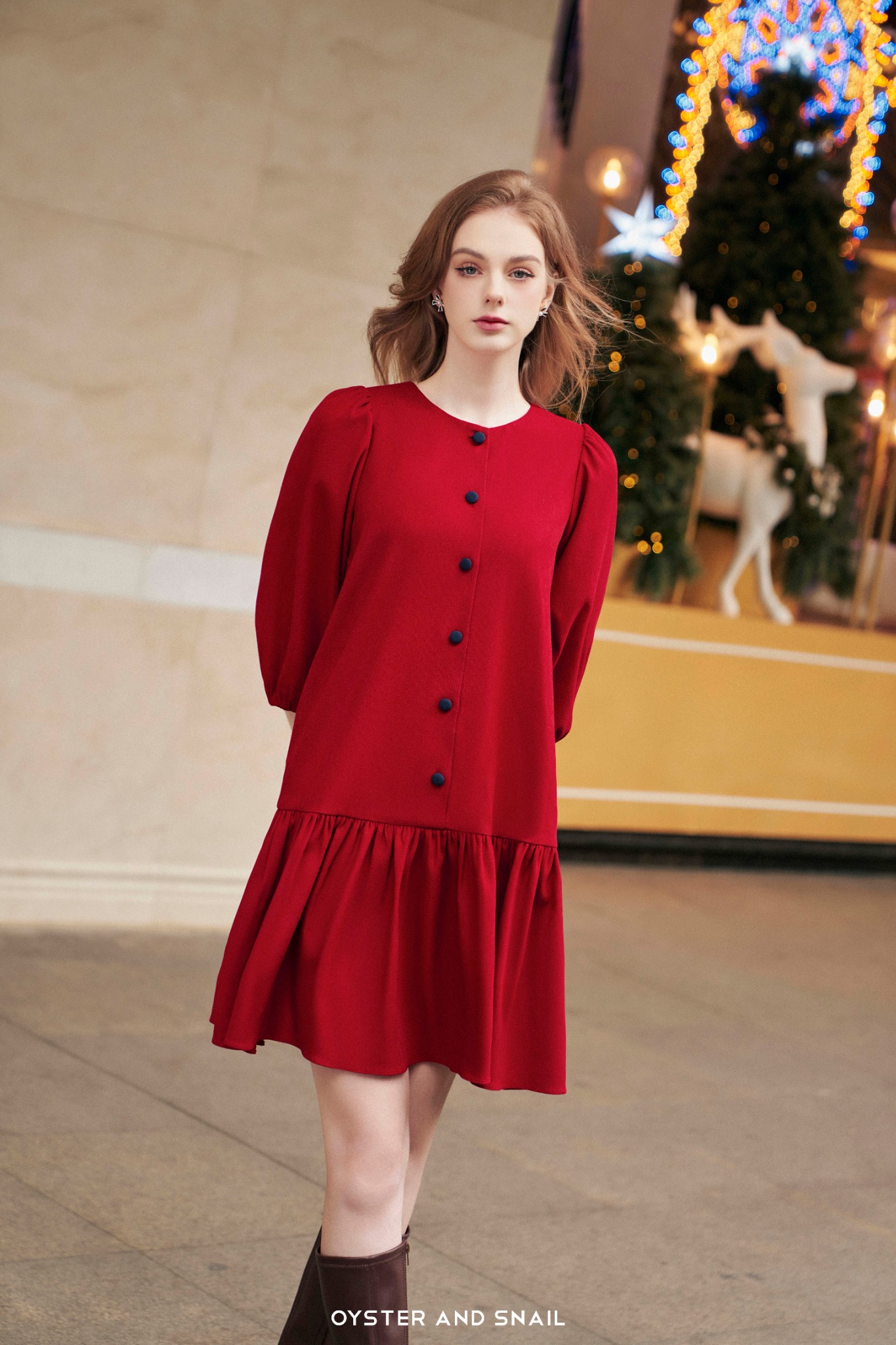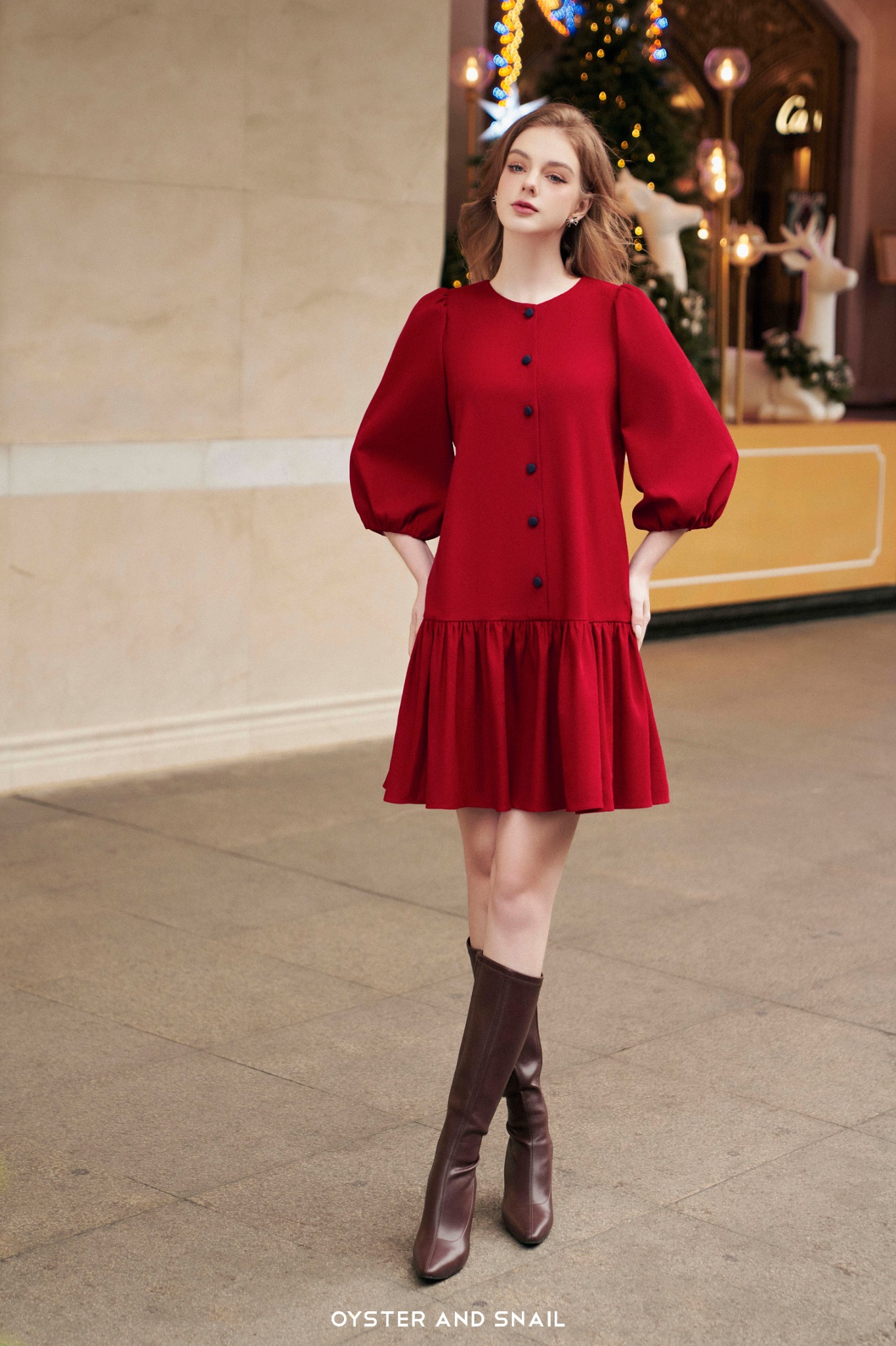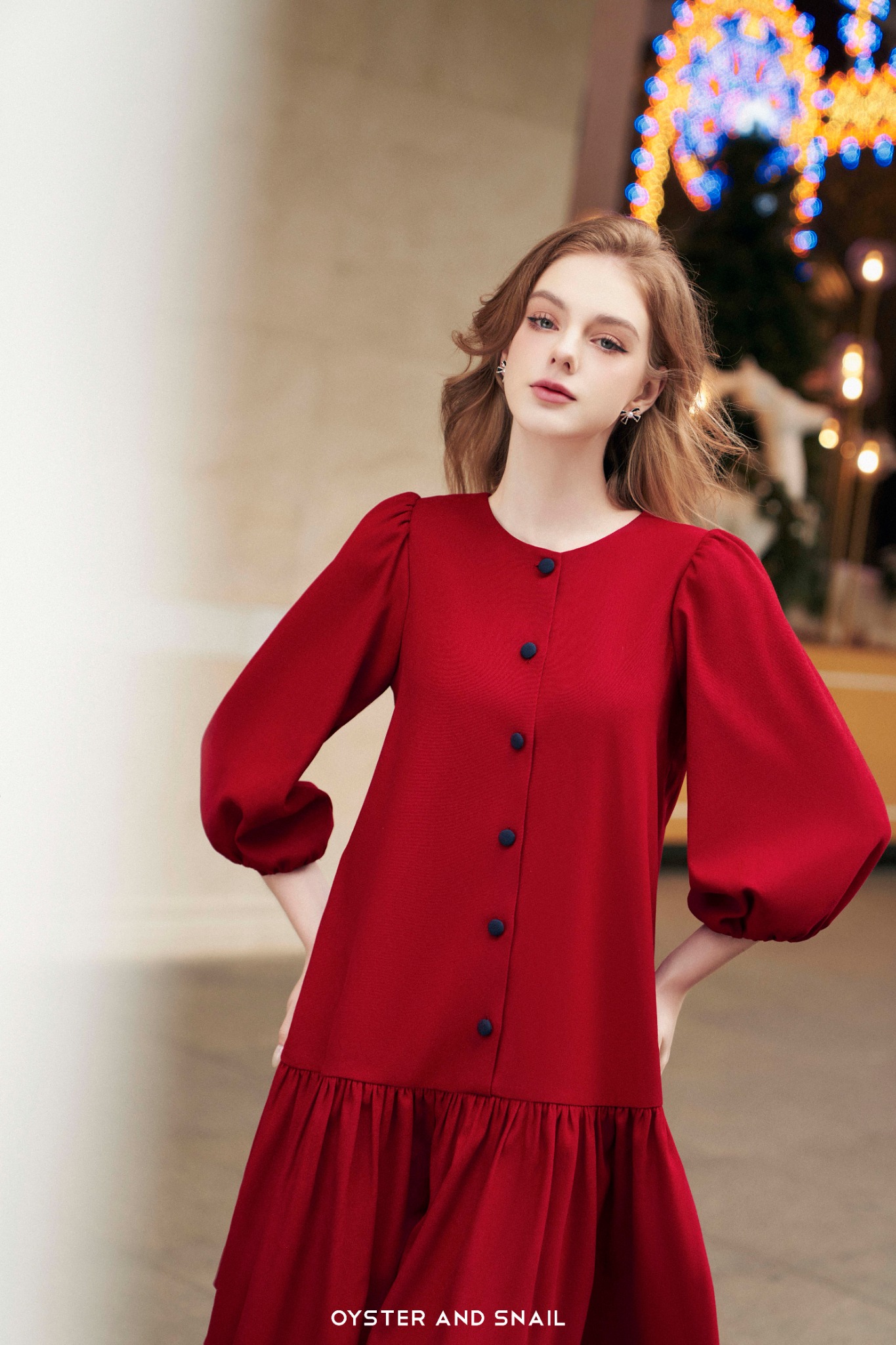 Váy công sở dáng suông, cổ tròn, tay bồng, cúc thật, đai rời.