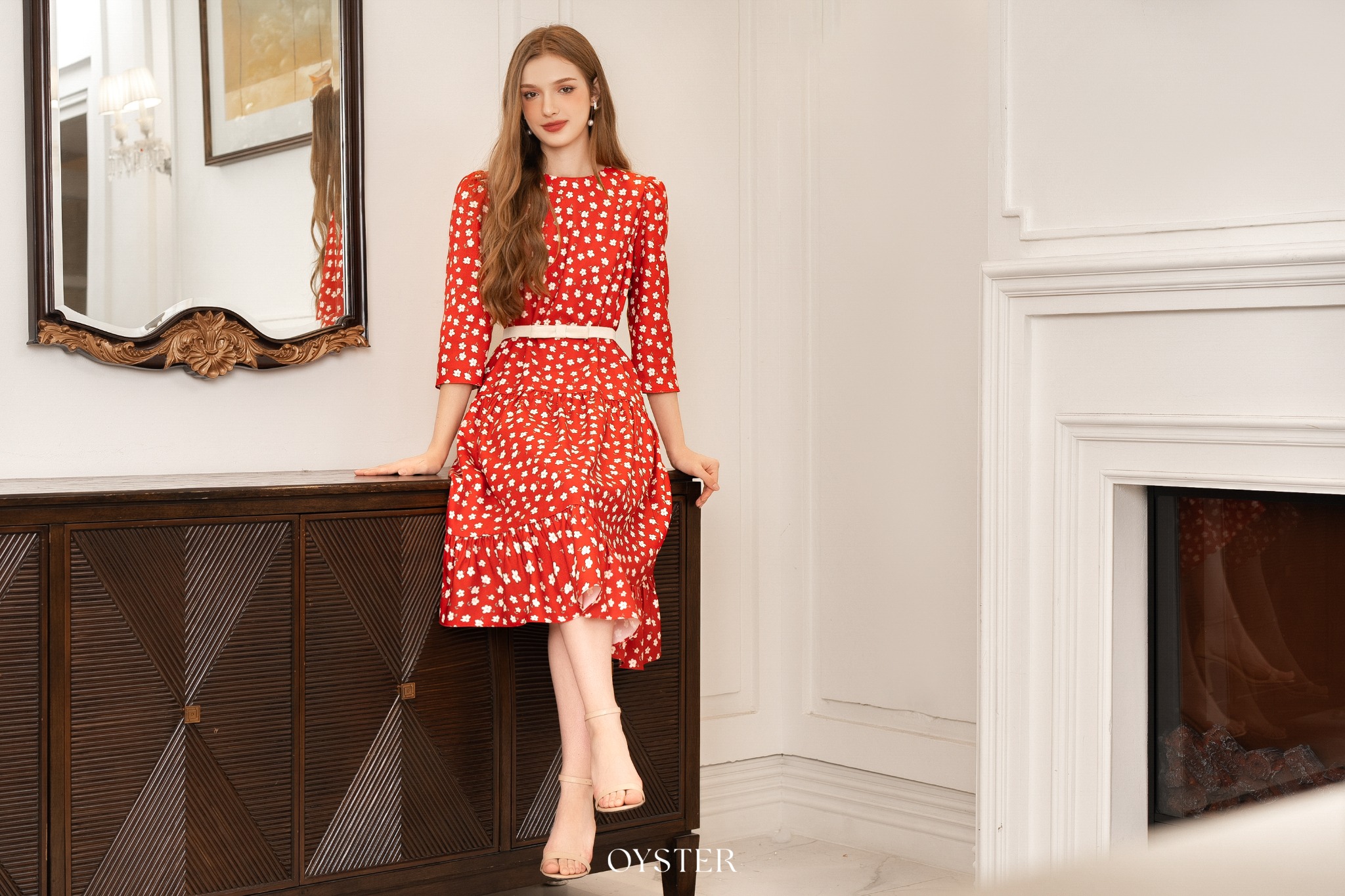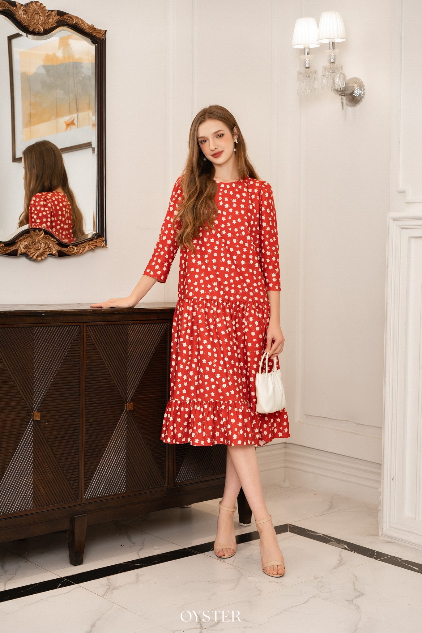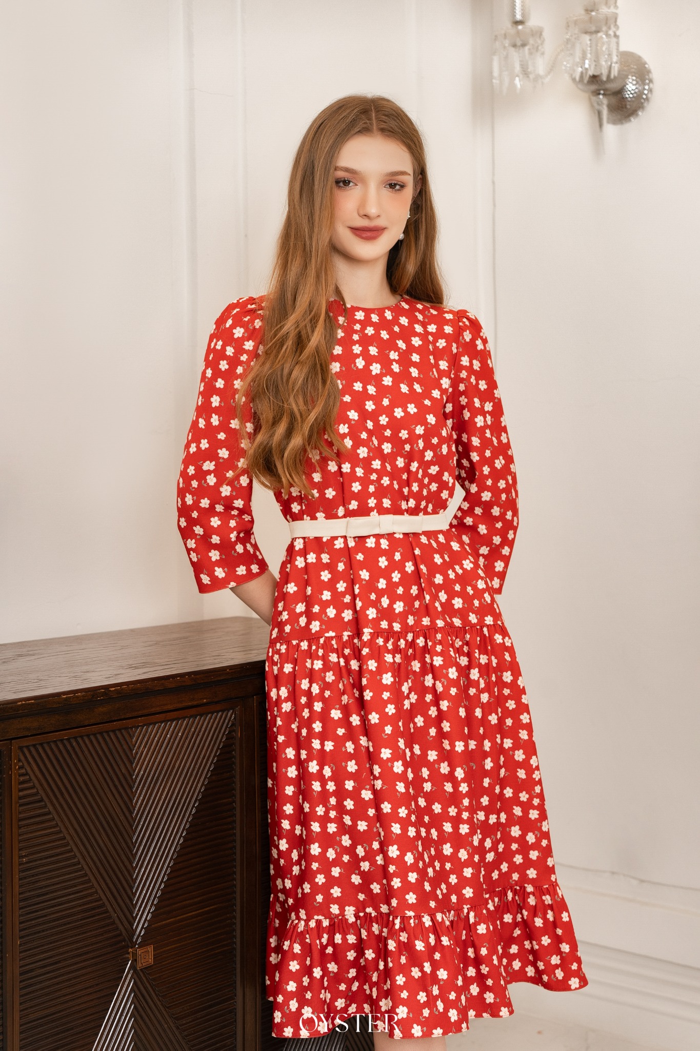 * Kiểu dáng: Váy cổ tròn, tay bồng nhẹ, kèm đai eo, chân váy nhúm phân tầng