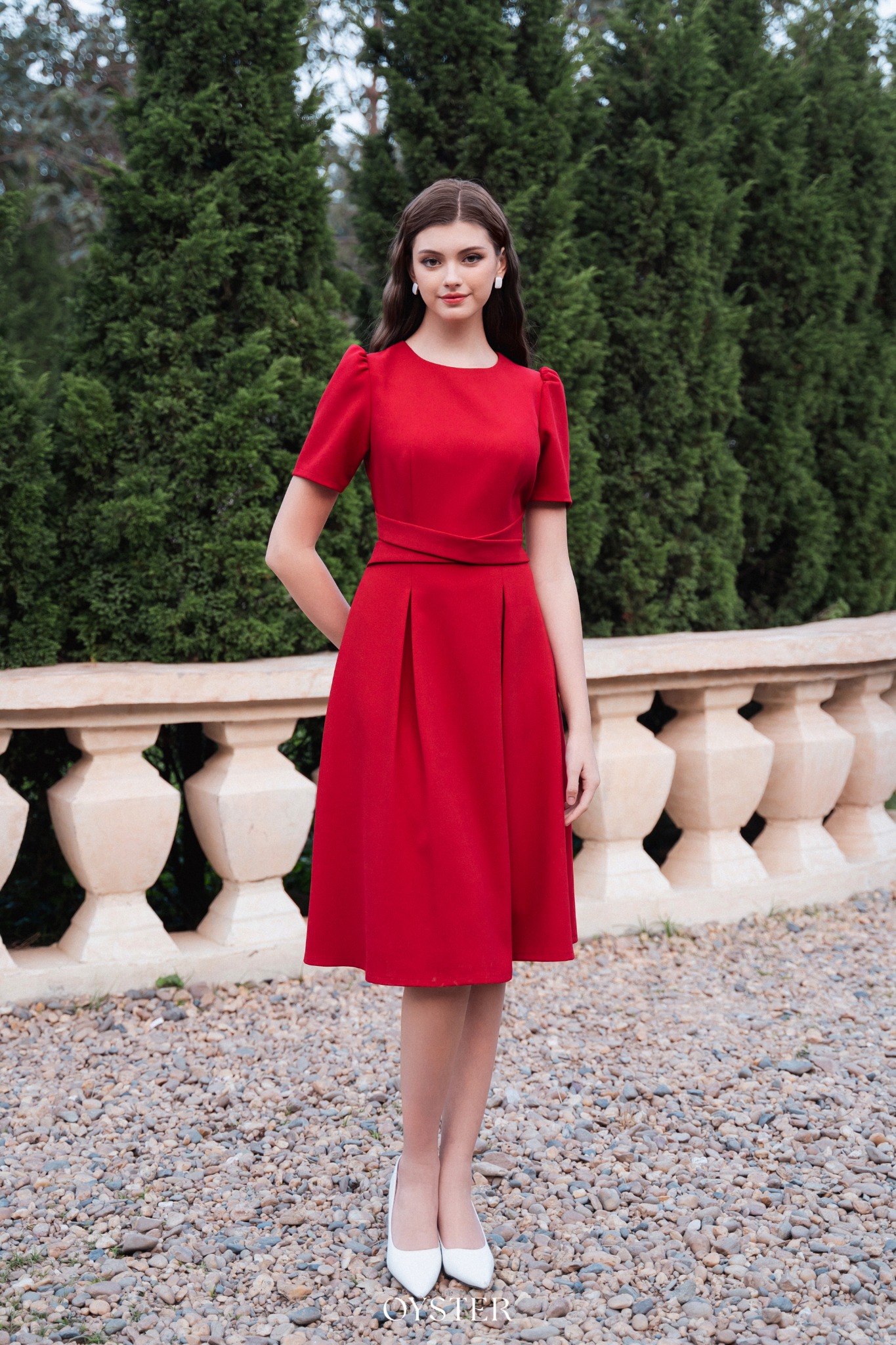 * Kiểu dáng: Váy cổ tròn tay bồng nhẹ, phối đai eo, chân váy xếp ly