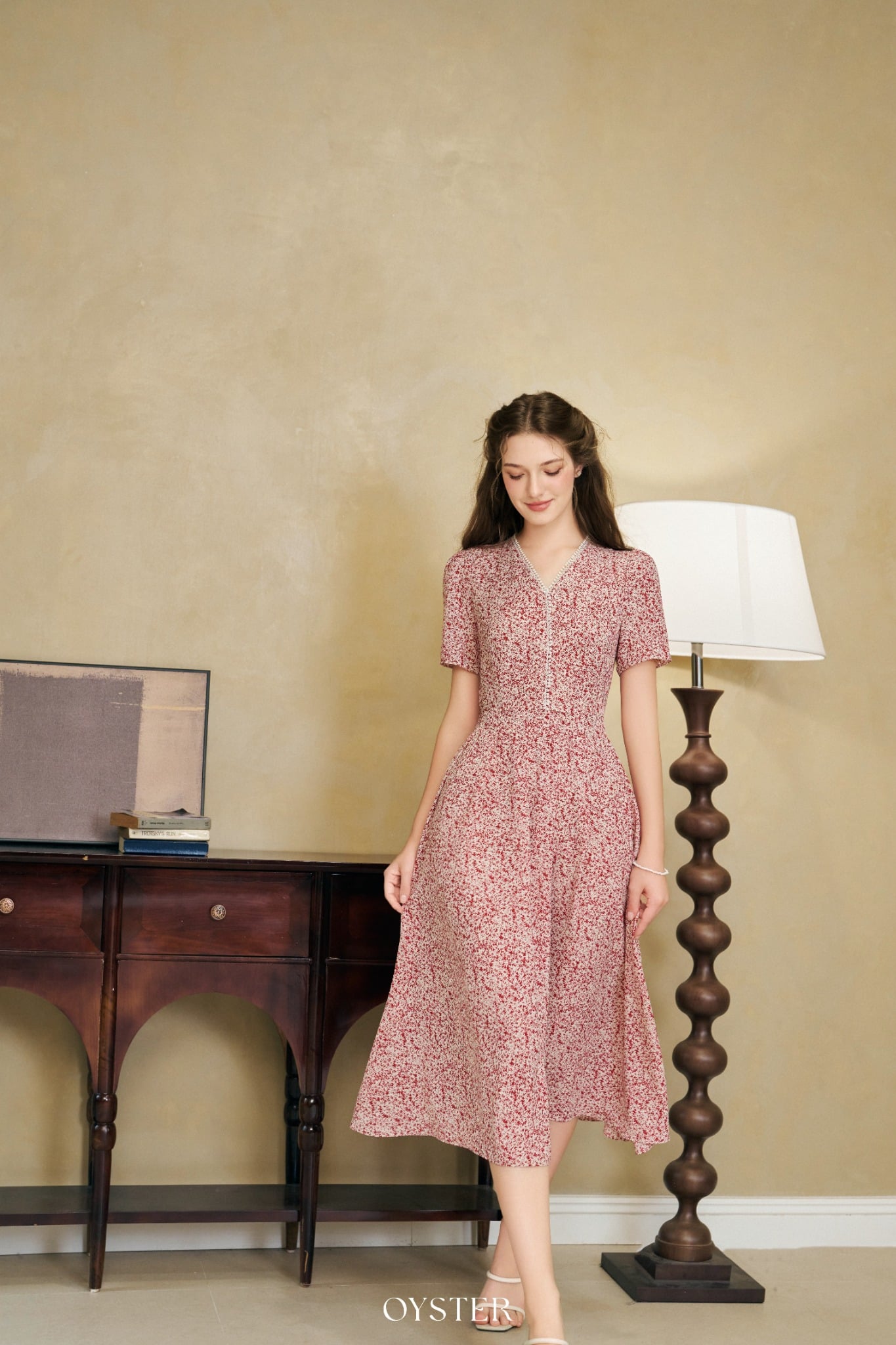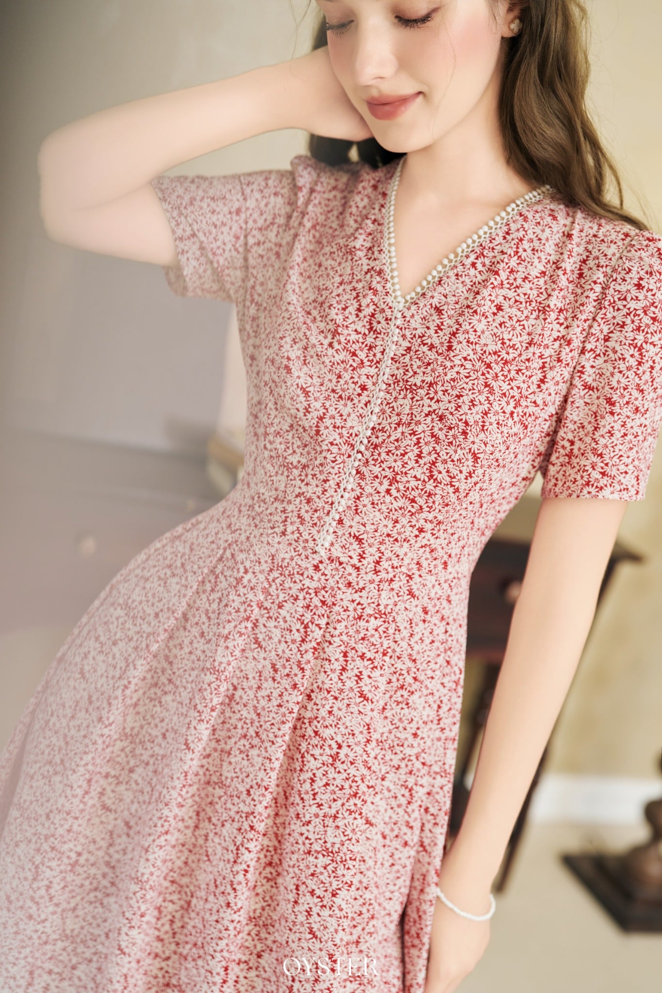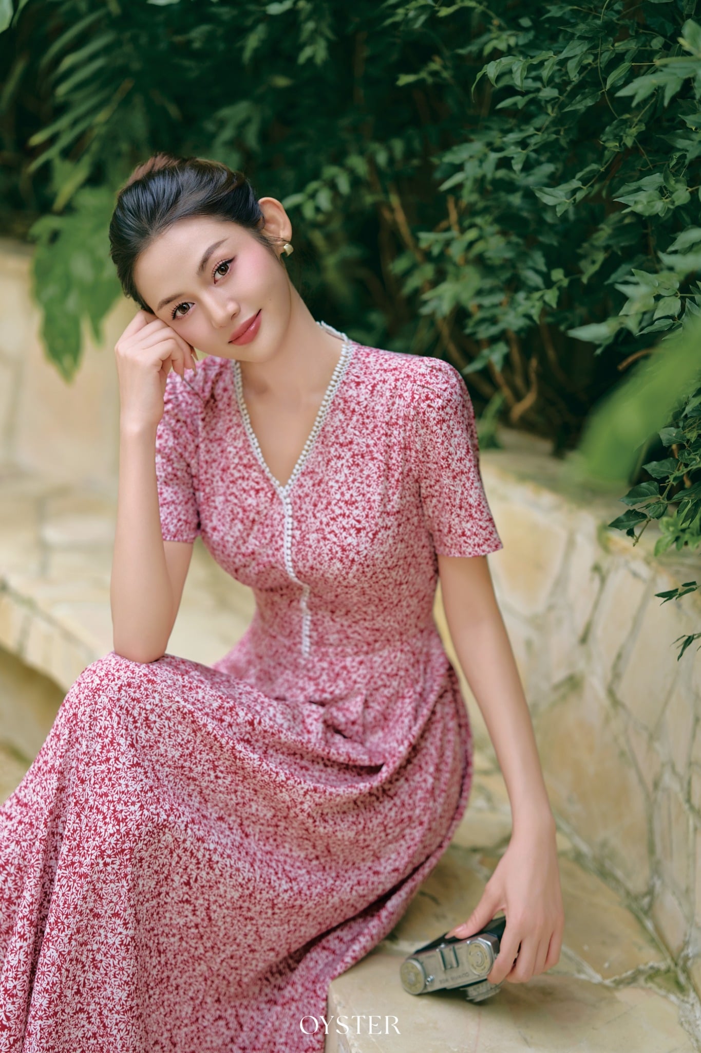 * Kiểu dáng: váy liền cổ v, tay cộc bo, chiết eo