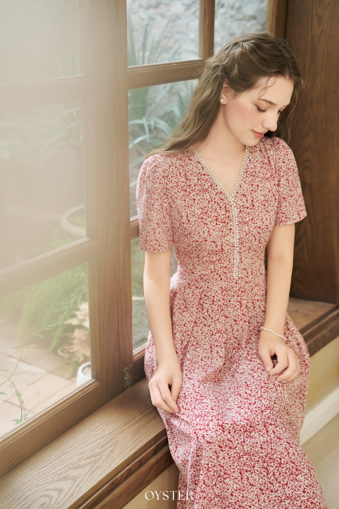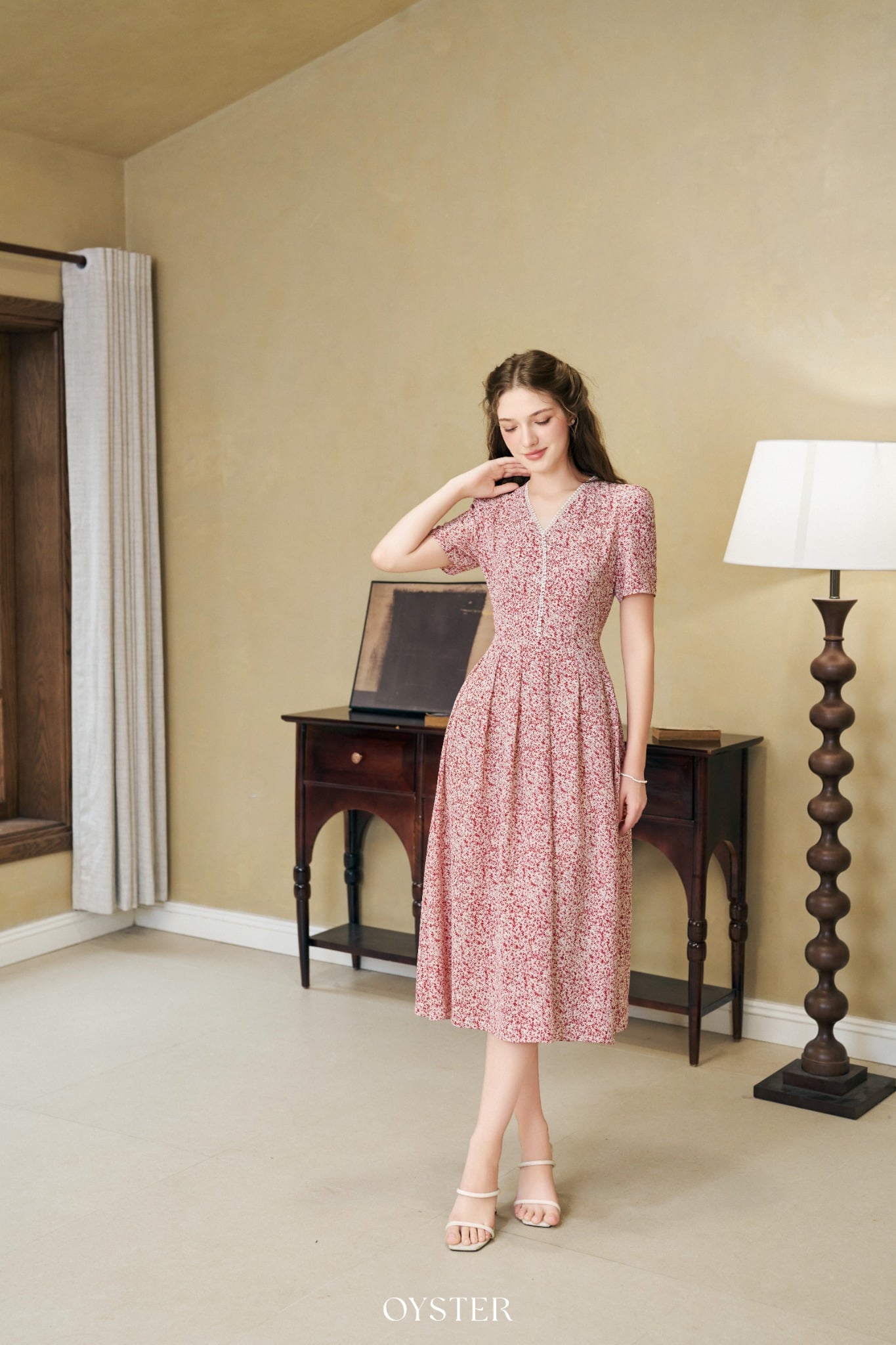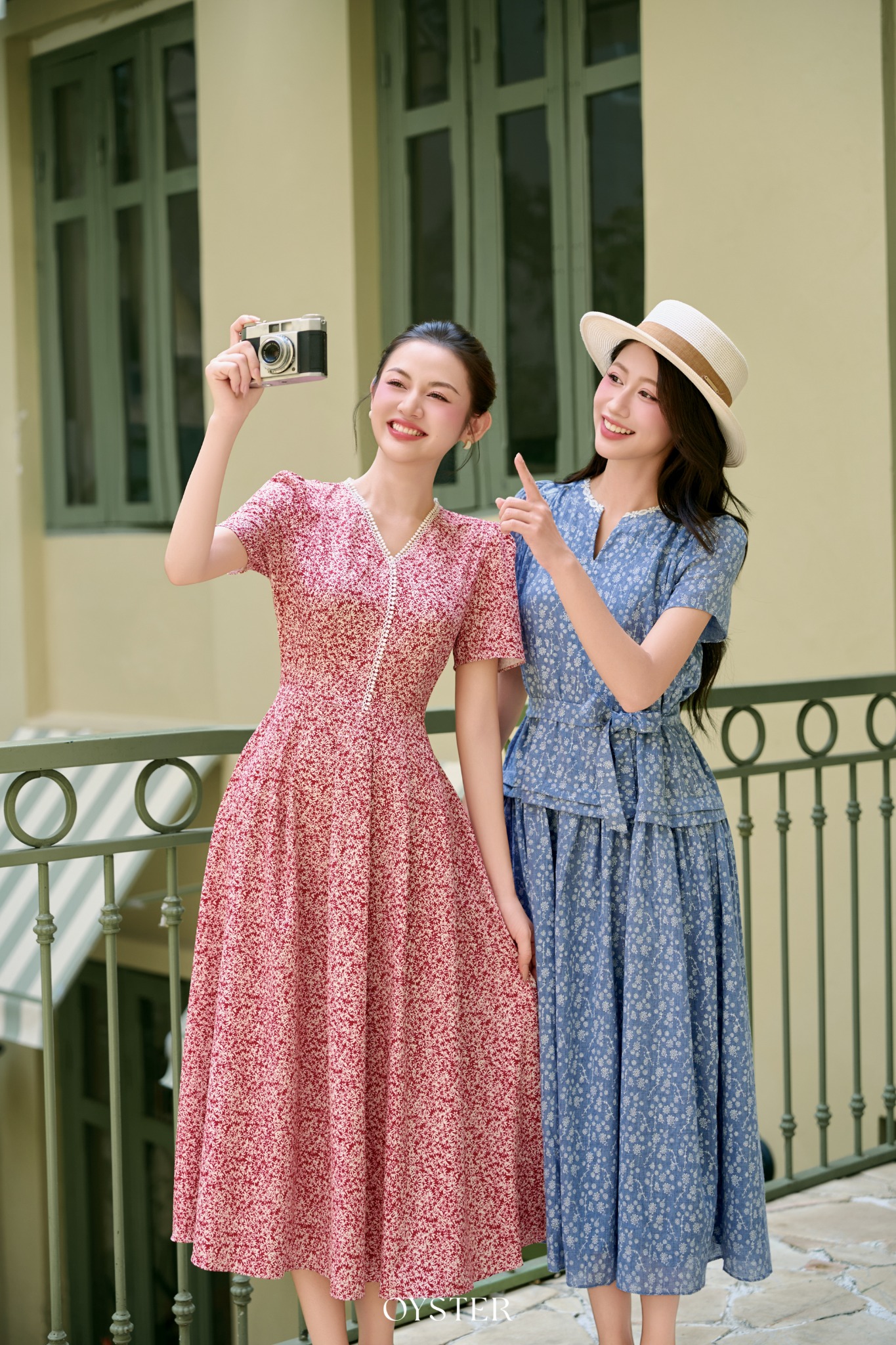 * Kiểu dáng: váy liền cổ v, tay cộc bo, chiết eo